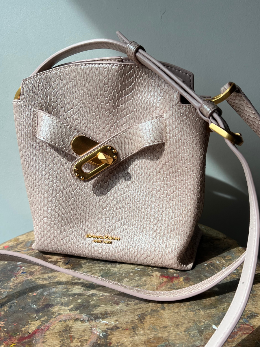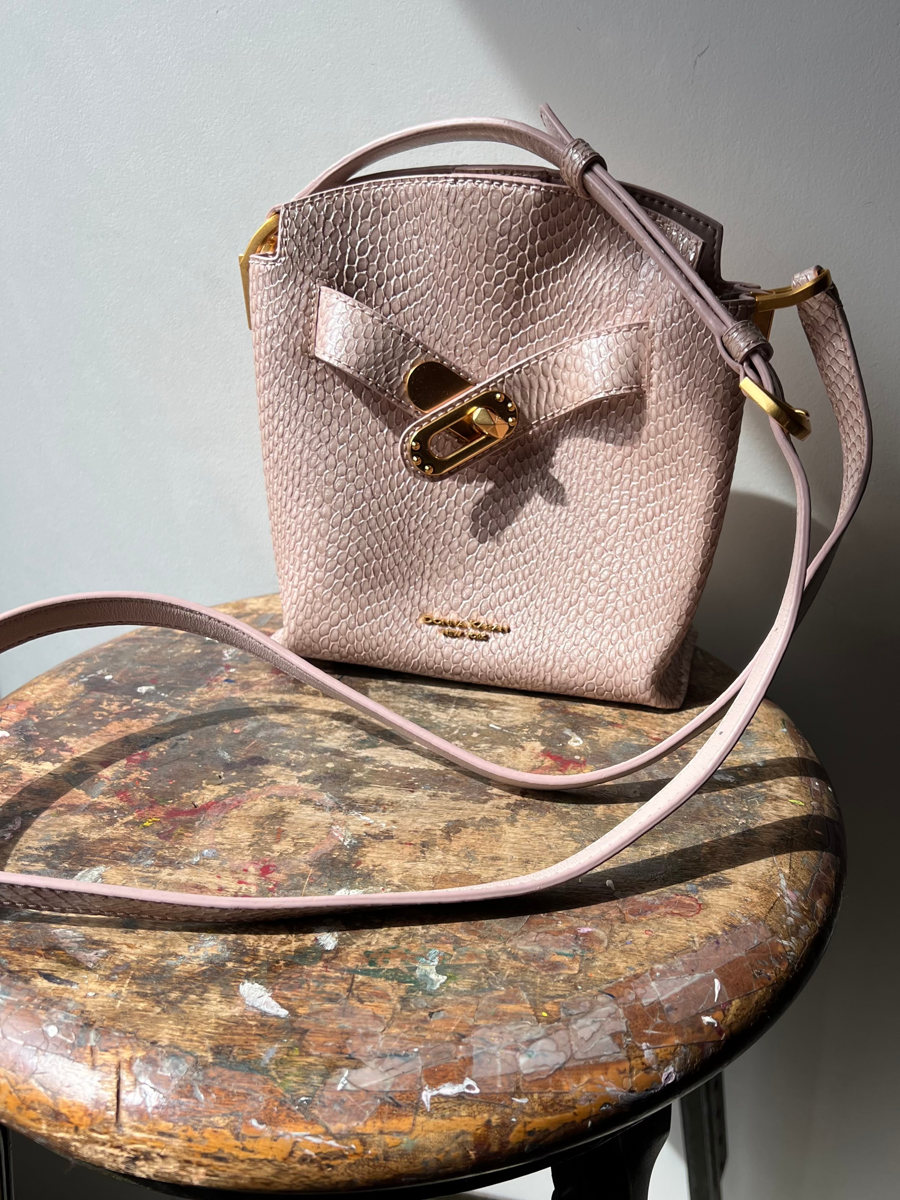 Crafted in rose-tone leather, this sleek crossbody features gold-tone hardware details and an adjustable strap focusing on both style and practicality.