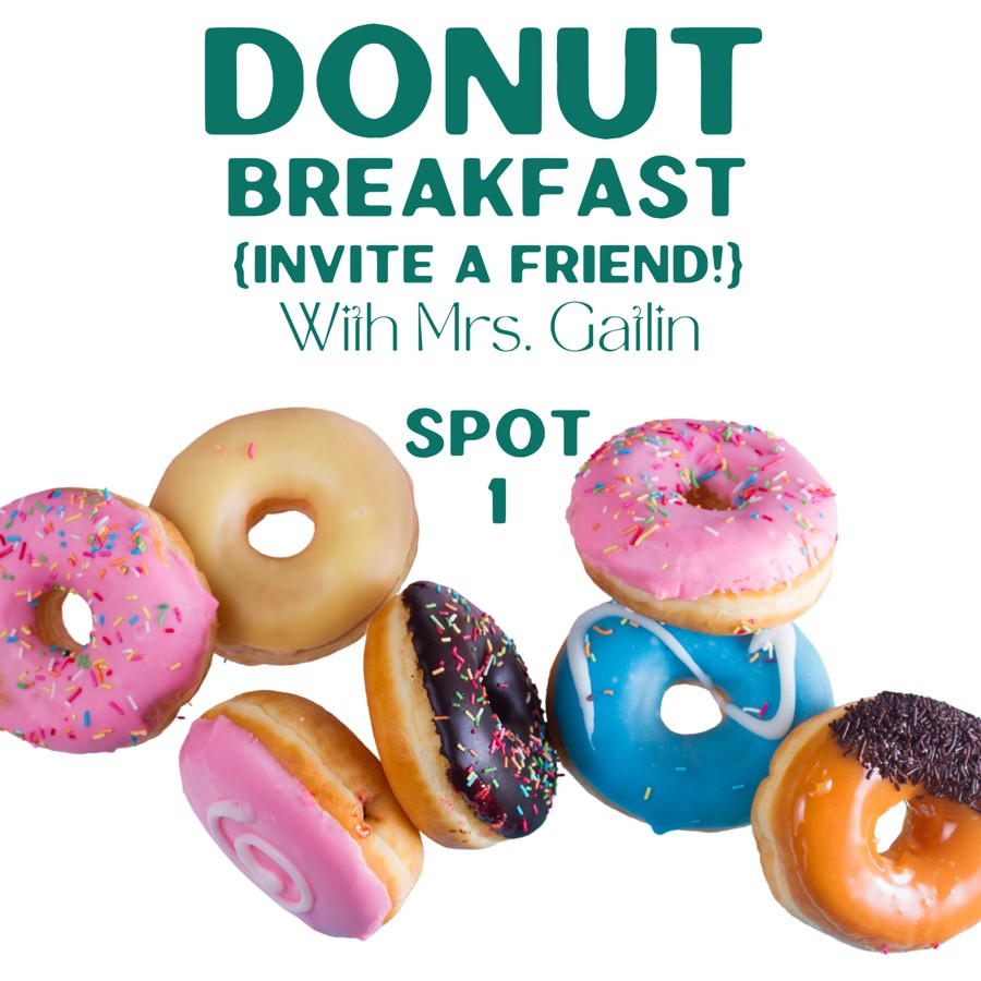 The winning bidder will join Mrs. Gatlin for a yummy donut breakfast (along with other breakfast items) and may also invite a friend! This breakfast will take place on April 4, 2025 in Mrs. Gatlin's Room at 7:00 a.m. There are two (2) available spots for this activity, you are bidding on one of them.
