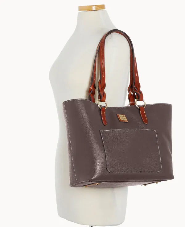 Introducing the Dooney and Bourke Pebble Grain Tammy Tote, a stylish and functional accessory for any occasion. This tote features a secure magnetic snap closure, ensuring your belongings are safe while on the go. With a strap drop length of 10 inches, it offers comfortable carrying options. The tote measures H 11.25" x D 6.5" x L 13.5", providing ample space for your essentials. Designed in Norwalk, CT by the renowned Peter Dooney, this tote showcases a sophisticated pebble grain finish that adds elegance to your outfit. Inside, you'll find one zip pocket for added security, along with two additional pockets for easy organization. The center zip divider compartment offers extra space for your items, while the dedicated cell phone pocket ensures your phone is always within reach. Plus, an inside key hook keeps your keys securely attached, making this tote not only stylish but incredibly practical. Don't miss the chance to own this beautiful Dooney and Burke Pebble Grain Tammy Tote!