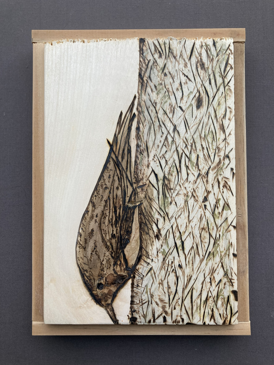 Artist statement: Andrew Webster is a building contractor living in Duluth Minnesota who enjoys creating unique artwork out of unique material almost exclusively salvaged from his job sites . “I delight in spotting brown creepers. For some reason I’m always surprised to see them. Perhaps it’s they’re diminutive size and silent tendencies that catch me off guard-