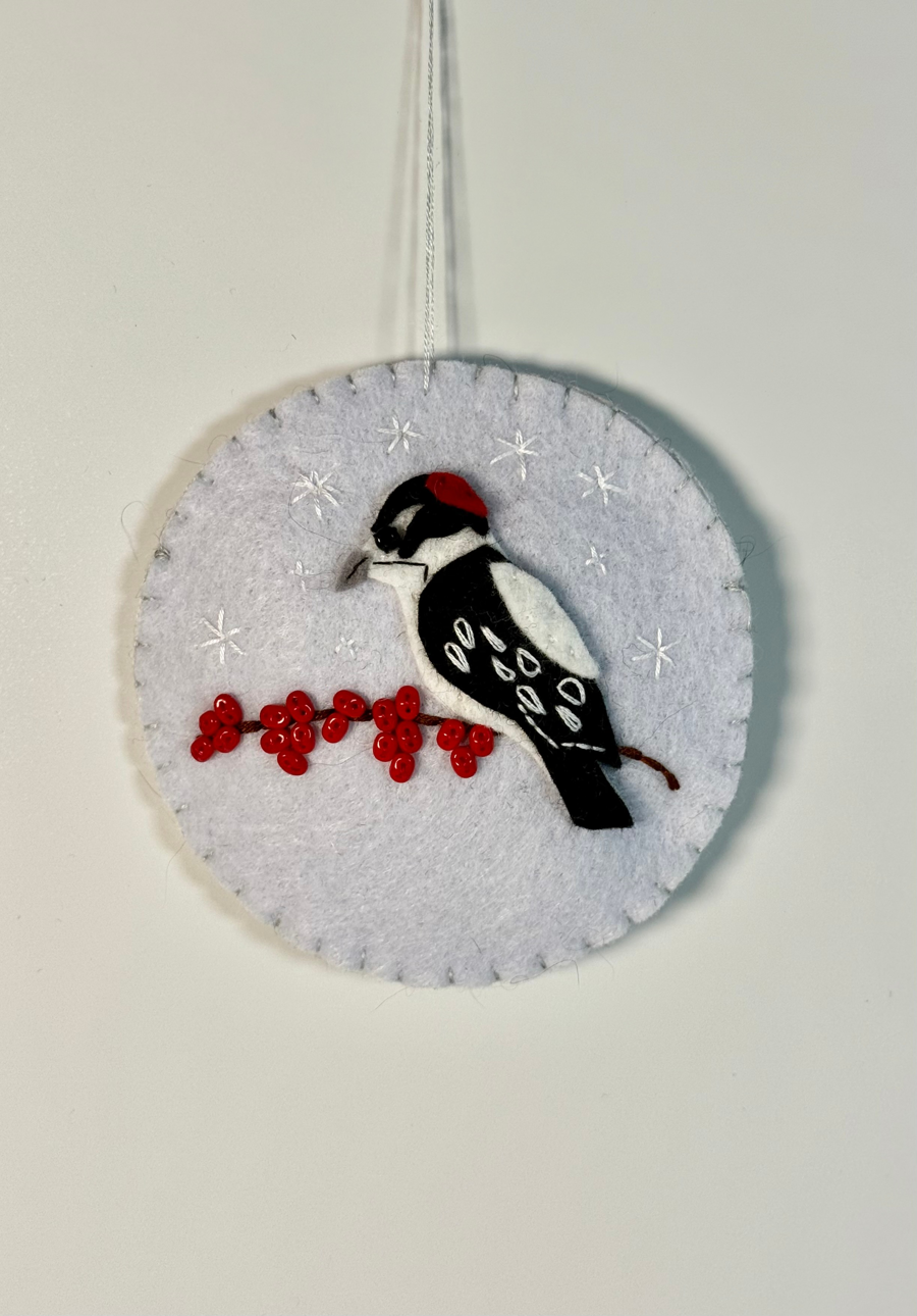 In a new series of one-sided, round ornaments from master-crafter, Ellen Murphy, the Downy Woodpecker is poised on branch amid bead berries.