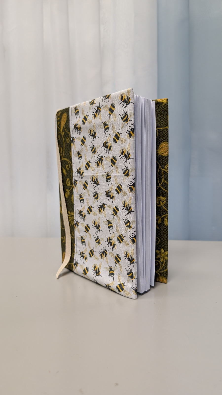 Made by our very own sewing class! Take home this 8" x 5 1/2" drafting notebook with handmade bumblebee patterned cover.