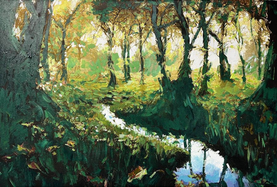 Experience the serene beauty of "Dreams of Streams," an exquisite acrylic on canvas painting measuring 20x30 inches, created by the talented artist Steven Lester. This captivating artwork features multiple shades of natural greens, beautifully capturing a tranquil tree landscape with a flowing stream. The harmonious blend of colors and the intricate details of the trees invite you to immerse yourself in nature's peaceful embrace. Perfect for any art lover or nature enthusiast, this piece is sure to enhance your living space and inspire a sense of calm. Don't miss the opportunity to own this stunning representation of nature's splendor.