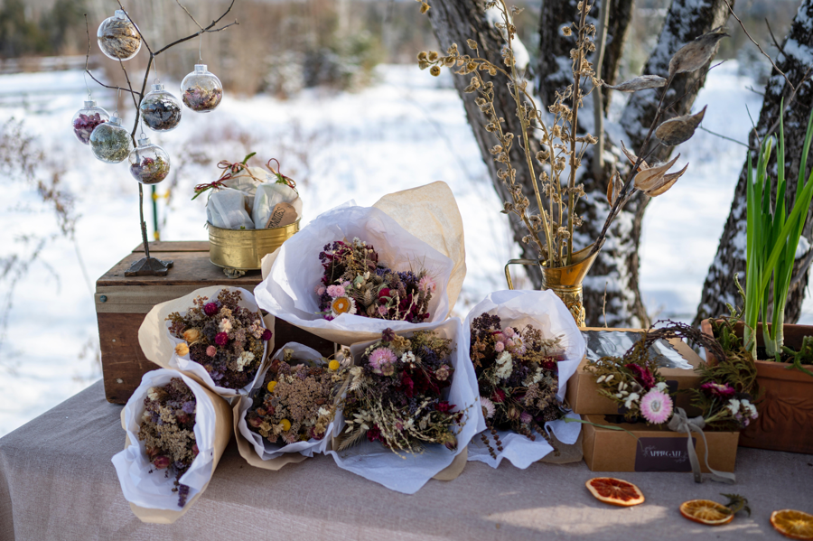 A beautiful dried flower bouquet from designer and flower farmer Emily Therrien, owner of Applegate Florals.