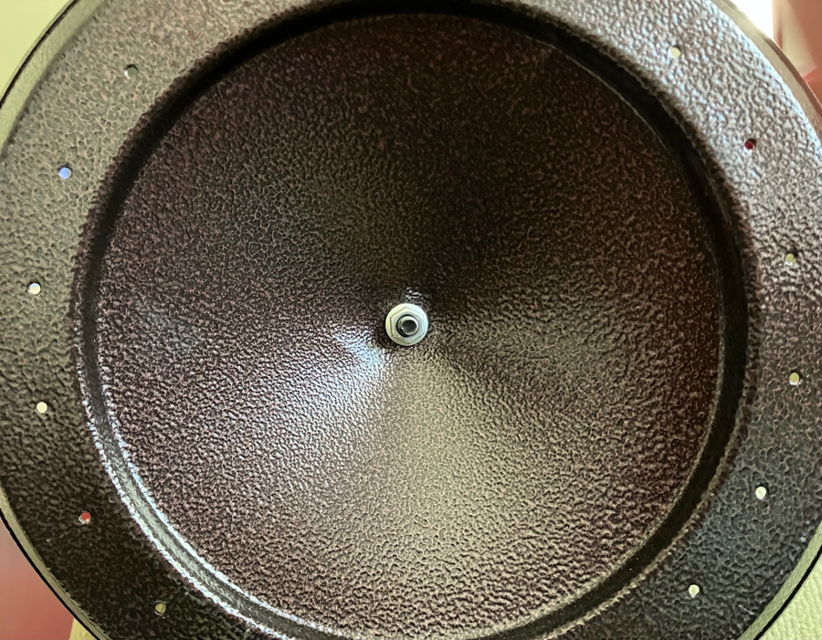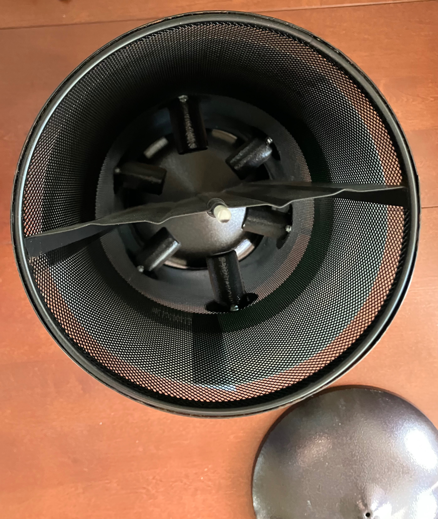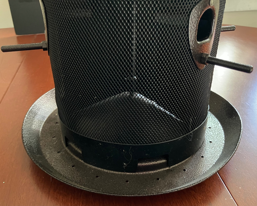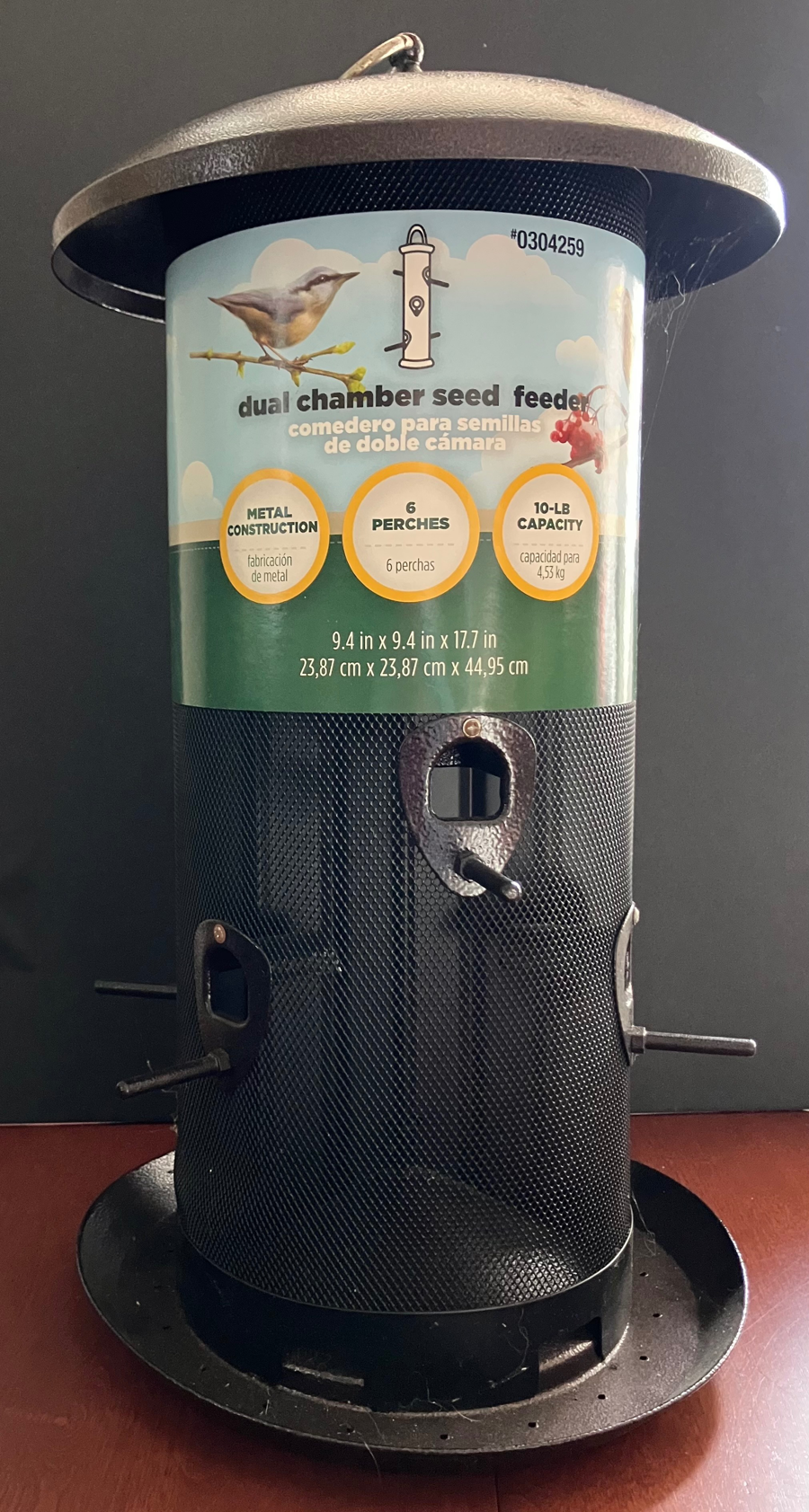 This large, bronze-tone tube feeder holds up to 10 lbs. of seed in 2 separate compartments. All metal construction provides durability. It has 6 feeding ports with perches, and measures 9.4` x 9.4` x 17.7 `. The hanging ring unscrews to remove the lid for filling. Some birds can cling to the mesh construction while others will perch at the ports. Small holes in the tray allow for rain drainage. This feeder is pre-owned but in good condition, with the original label.