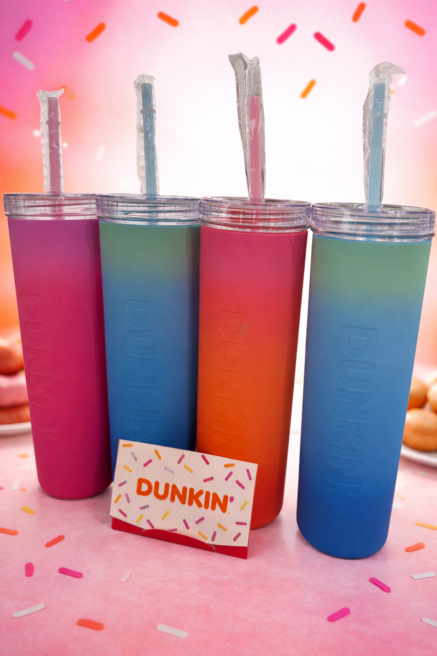 4 tumblers with straw and $50 Dunkin Donuts gift card