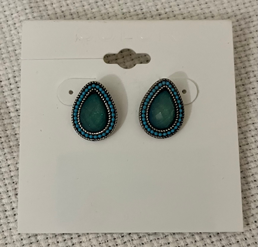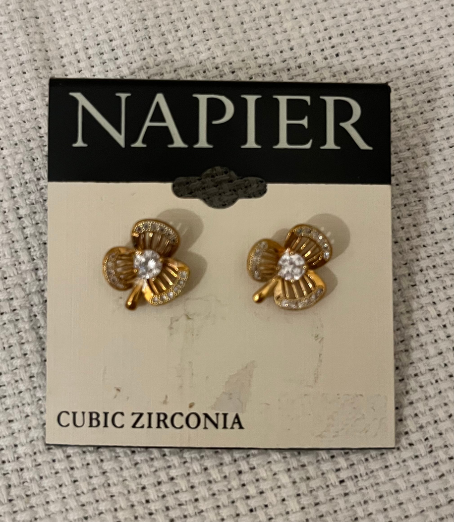 This fun bundle of four pairs of earrings will expand your collection or make great last-minute holiday gifts! Featuring: asymmetrical Guess earrings in silver tone with small rhinestones; gold-tone Shamrocks with cubic zirconia by Napier; black flower studs by Thalia with sparkly rhinestone centers; and a pair of sparkly green-blue tear drop earrings by Color.