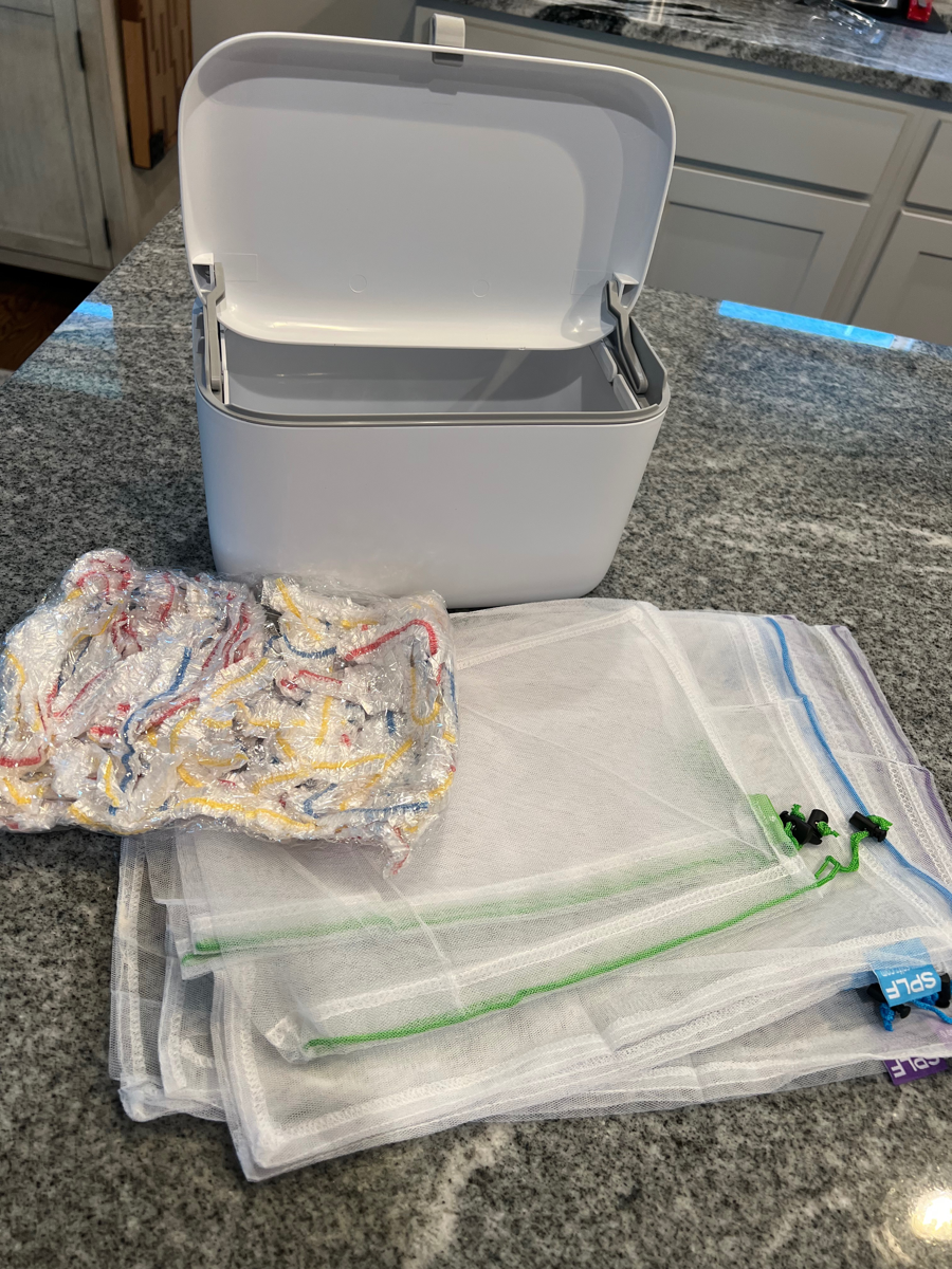 Countertop compost bin, reusable container lids, reusable mesh produce bags