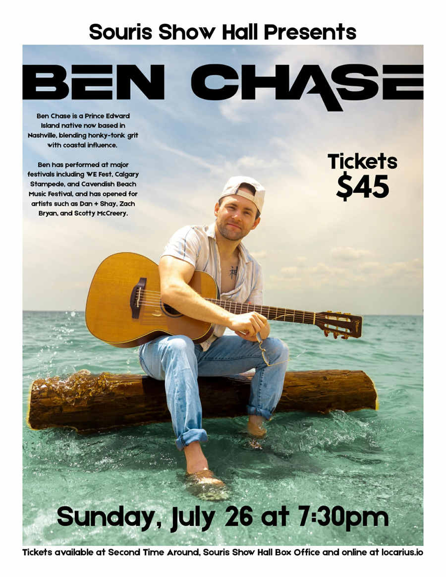 Next, visit the Souris Show Hall for a concert by accomplished up-and-coming country artist Ben Chase! Known as the "Saltwater Cowboy," Ben Chase is one of country music’s rising stars, blending honky-tonk fun with breezy, waterfront vibes in his self-described "Tiki Tonk" genre. His music transports you straight to vacation mode, whether you're on a boat, at the lake, or simply tackling your daily routine while dreaming of vacation.