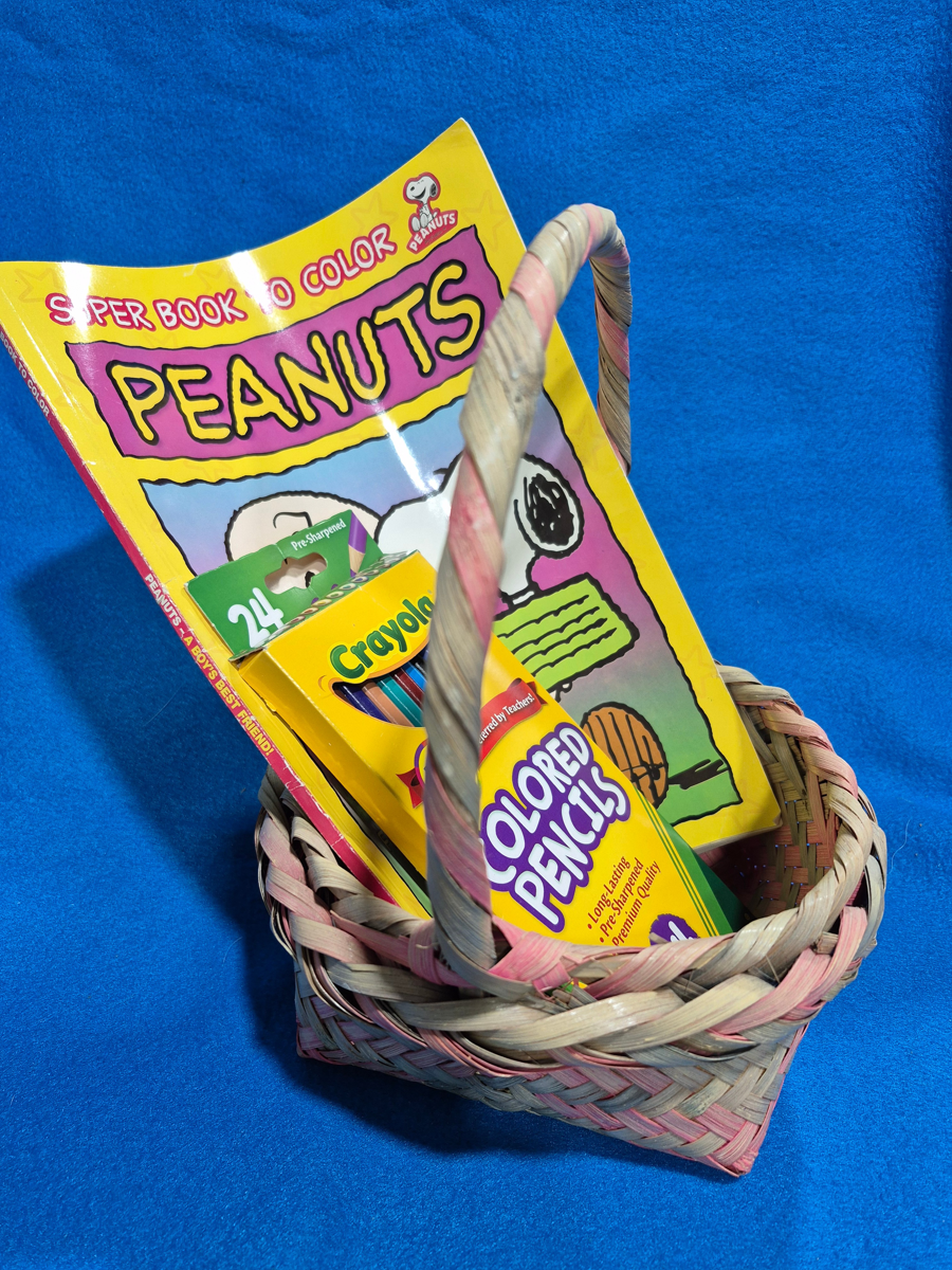 Easter baskets with a Snoopy coloring book and 24 colored pencils