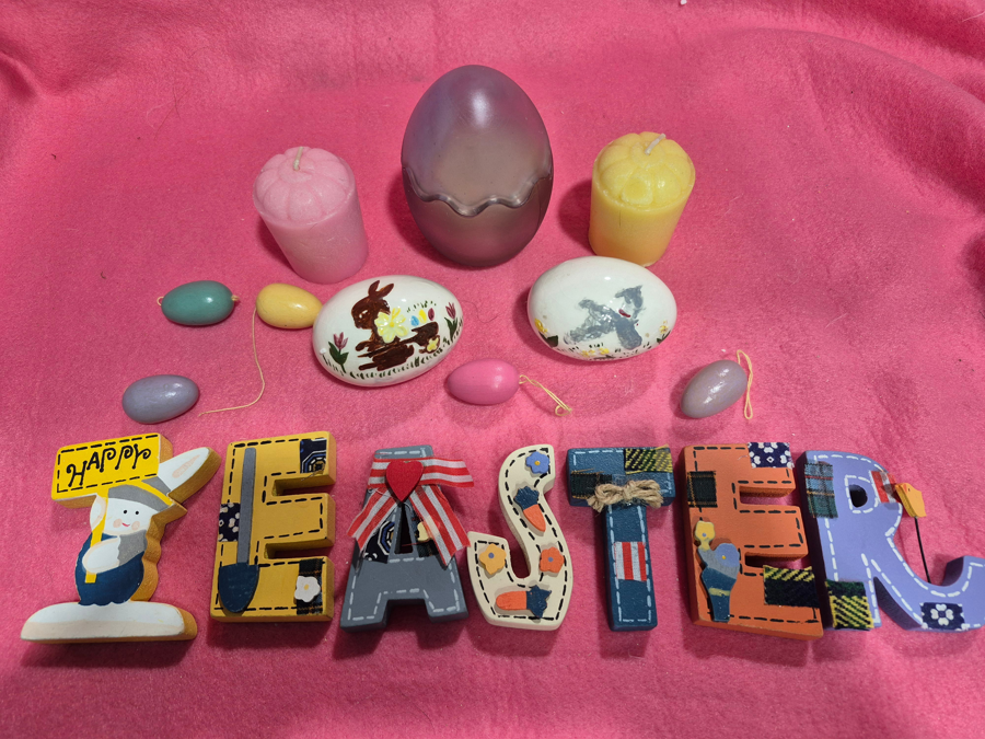 Easter variety pack of decorations, includes votive candle, refills, wooden and china decor.