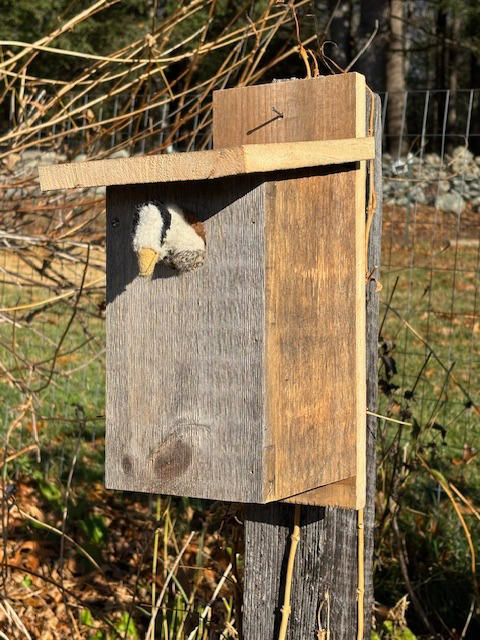 These environmentally friendly bird boxes are made with loving care from resourced materials including weathered cedar barn board, standard-sized license plates, mahogany, plywood and nylon venetian blind cord. The 1-1/2” diameter entrance is ideal for the Eastern Bluebird (and Tree Swallow). Position the nesting box on a post or pole in an open area, such as a meadow, field, or back yard, with the entrance hole facing east. One side of the box is hinged allowing access to the old nest that should be cleaned out as soon as a brood fledges so that the box can be used for a second nesting attempt. The Eastern Bluebird feasts on ground-dwelling insects including beetles, crickets, grasshoppers and caterpillars. They also eat fruit and berries.