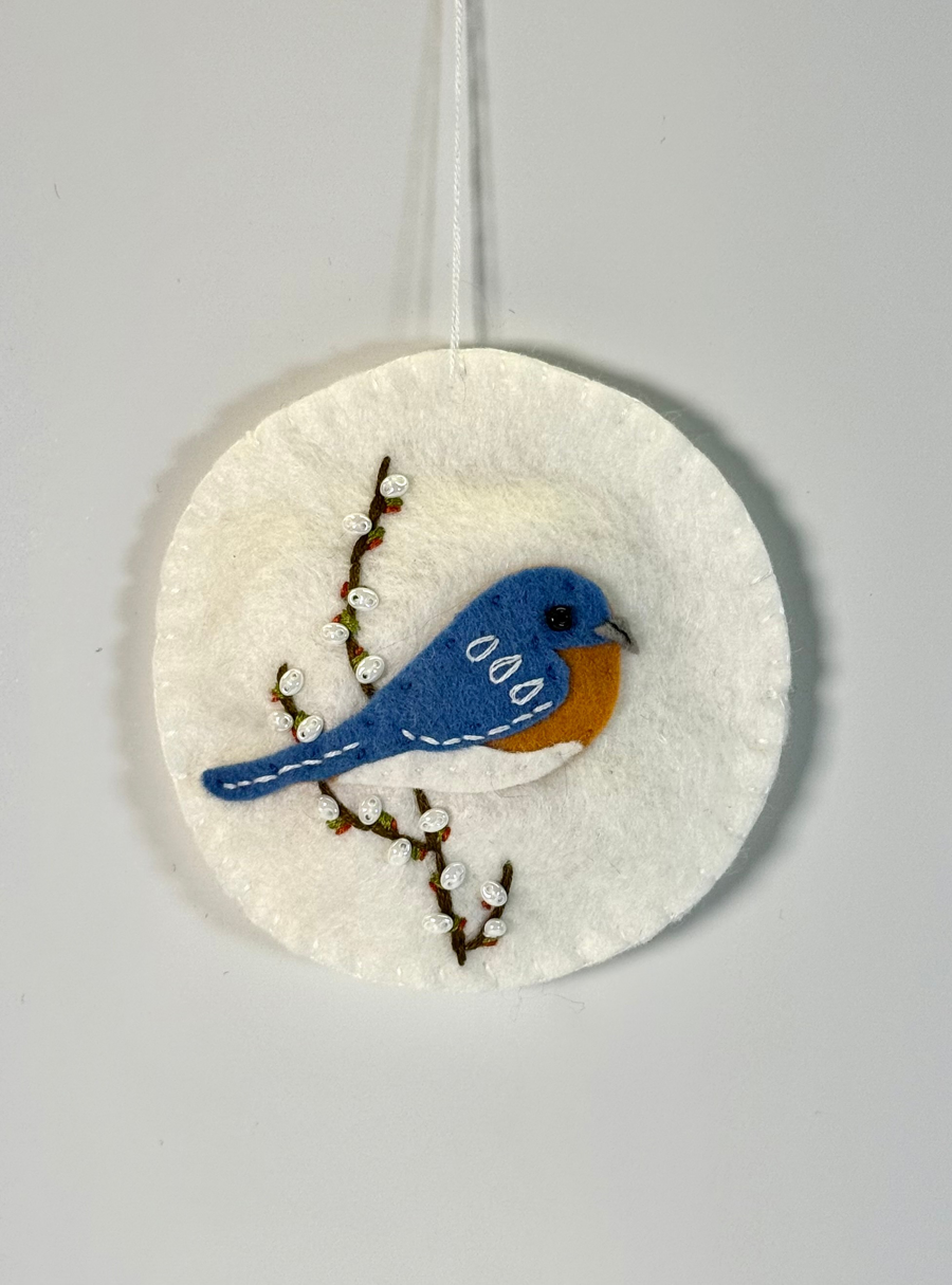 The delightful Eastern Bluebird is found among the bead berries in this round version of Ellen's felt ornaments.