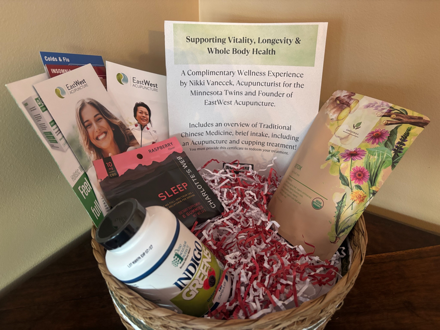EastWest Acupuncture Basket: A complimentary wellness experience by Nikki Vanecek, Acupuncturist for the Minnesota Twins and Founder of EastWest Acupuncture. Includes an overview of Traditional Chinese Medicine, brief intake, including an Acupuncture and cupping treatment. NEVER EXPIRES. Also incudes a bottle of Ortho Molecular Products Indigo Greens (180 capsules), Gardenika Detox Loose Leaf Tea and pack of 6 Charlotte's Web raspberry flavor gummies.