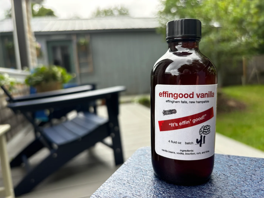 A 4oz ounce bottle of Effingood Vanilla made in Effingham, NH. Made with a special variety of vanilla beans and the perfect blend of liquors, Effingood vanilla is a smart choice.