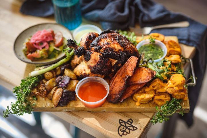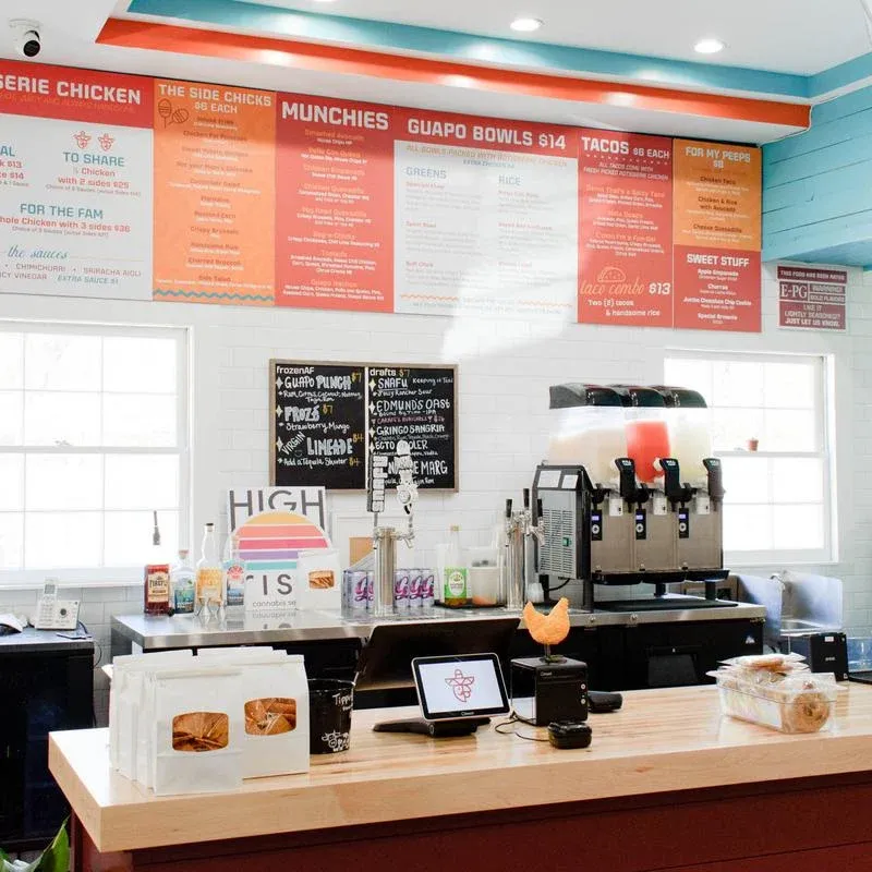A neighborhood rotisserie joint featuring whole roasted chickens, fresh sides, tacos and salads.
