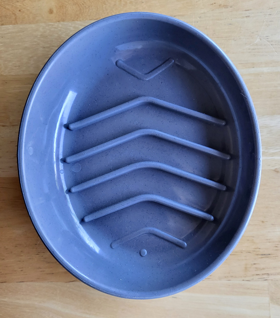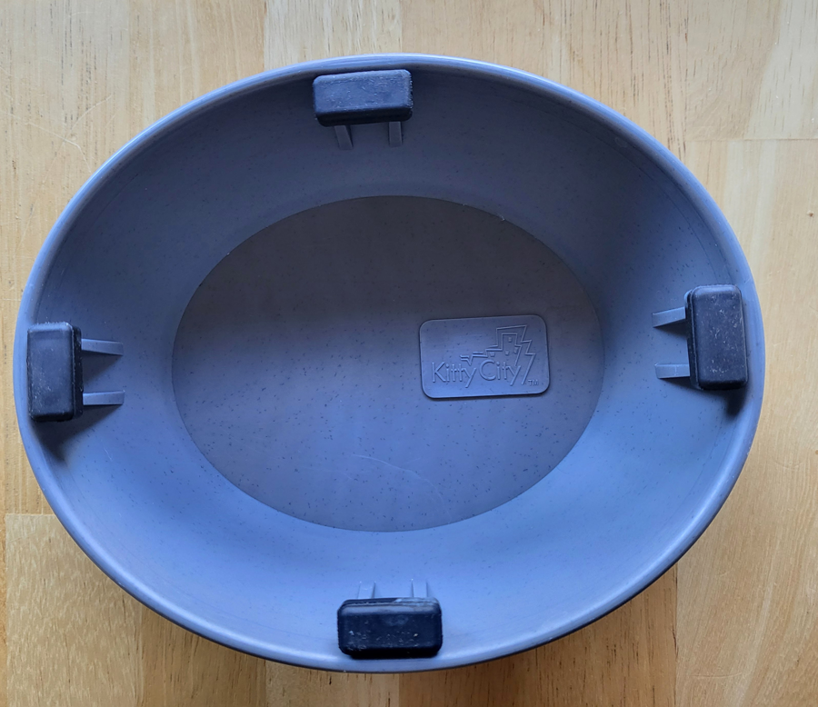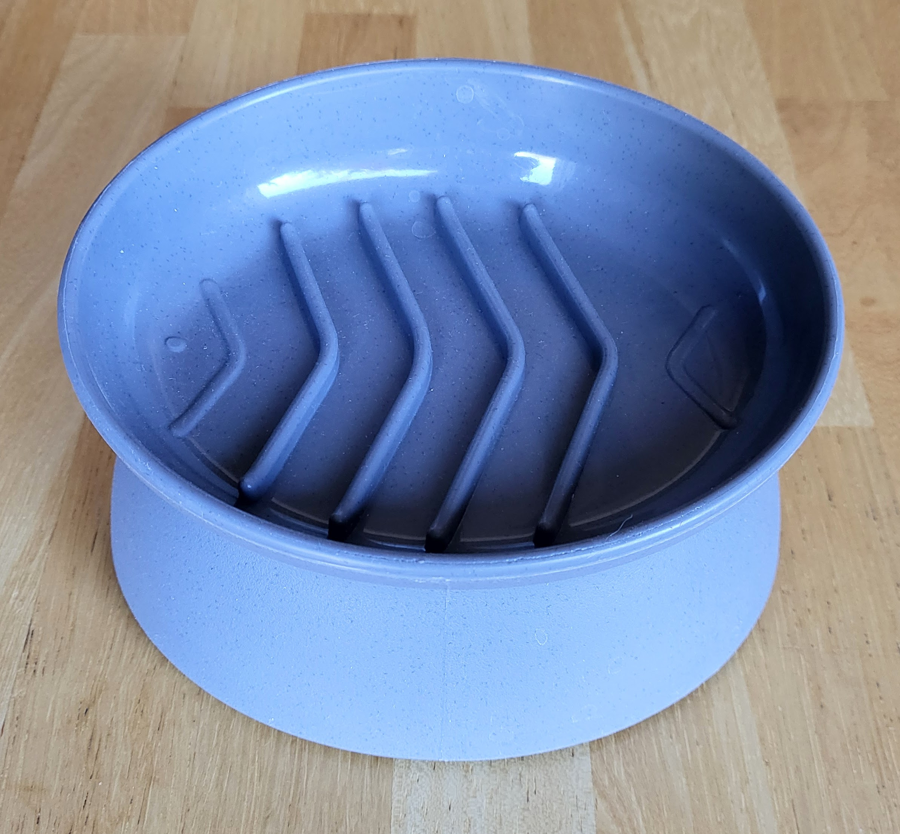 Kitty City Slow-Eater Raised Cat Bowl features elevated ridges inside a raised basin to slow down eating pace and prevent vomiting, and choking. Made of durable grey colored polypropylene plastic. Holds approximately 6.5 oz of food, and measures about 6" x 5" x 2.5" tall.