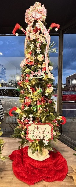 A 7 ft tree of fun and joy! Elves make everyone HAPPY! Covered in all things Elf with a comfy red fleece blanket and 5 Free Chick Meals from Chicken Salad Chick!