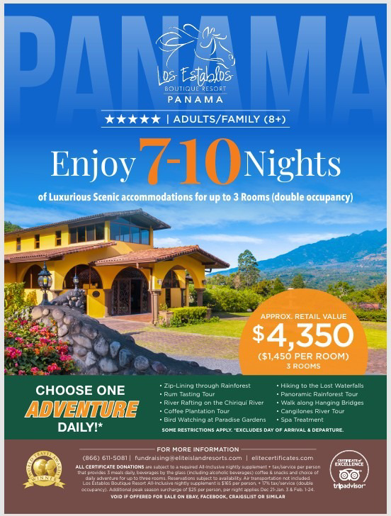 LIVE AUCTION ITEM Enjoy 7-10 nights at Los Establos Boutique Resort, where you can experience luxurious scenic accommodations for up to 3 rooms (double occupancy) designed for ultimate relaxation and comfort. Our exclusive resort features elegant rooms making it the perfect getaway for couples, families, or friends seeking a tranquil retreat. Surrounded by breathtaking views and lush landscapes, Los Establos offers a unique blend of sophistication and natural beauty, ensuring an unforgettable stay for all our visitors. Indulge in the serene atmosphere and let the charm of our boutique resort elevate your vacation experience. Choose One Adventure Daily! • Zip-Lining through Rainforest • Rum Tasting Tour • Hiking to the Lost Waterfalls • River Rafting on the Chiriquí River • Coffee Plantation Tour • Panoramic Rainforest Tour • Walk along Hanging Bridges • Cangilones River Tour • Bird Watching at Paradise Gardens • Spa Treatment SOME RESTRICTIONS APPLY. *EXCLUDES DAY OF ARRIVAL & DEPARTURE FOR MORE INFORMATION (866) 611-5081 | fundraising@eliteislandresorts.com | elitecertificates.com ALL CERTIFICATE DONATIONS are subject to a required All-Inclusive nightly supplement + tax/service per person that provides 3 meals daily, beverages by the glass (including alcoholic beverages) coffee & snacks and choice of daily adventure for up to three rooms. Reservations subject to availability. Air transportation not included. Los Establos Boutique Resort All-Inclusive nightly supplement is $165 per person, + 17% tax/service (double occupancy). Additional peak season surcharge of $25 per person, per night applies Dec 21-Jan. 3 & Feb. 1-24. WINNER - Please pick up certificate at close out desk