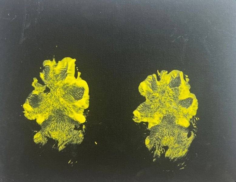 Paw painting made by mid-content wolfdog Enya. One of our smallest and spiciest rescues, Enya had gone through more companions that likely any other animal in Wild Spirit's history, making it constantly clear that as her Caretakers and Matchmakers, we have yet again FAILED to meet her expectations for a canine union. As such, she has spent the better part of the last year and a half living as a single lady, which she seems just fine with. Enya came to Wild Spirit with her mother, Kitana, and uncle, Sirius.