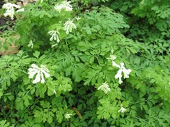 Corydalis ochroleuca, commonly called corydalis or white corydalis, is an often short-lived, open woodland, herbaceous perennial that typically grows in a mound to 12-20” tall and to 16-24” wide. It is native to rocky woodland areas of southern and eastern Europe. It has naturalized in parts of western Europe. Clean, finely-divided, lacy, pinnately decompound, blue-green leaves are glaucous on both surfaces. Narrow-tubular, pendulous, fragrant, pale yellow to creamy white, 4-petaled flowers (each to 5/8” long) bloom June to October in axillary racemes. Each flower has a spur on one end and open soft-yellow lips at the other end.