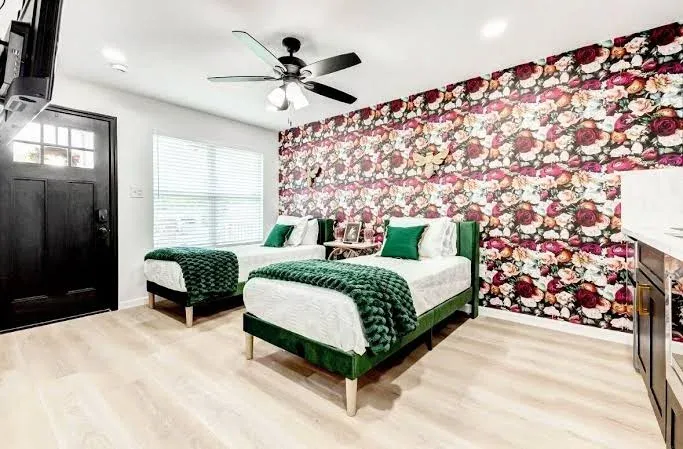 Relax in a beautifully designed space featuring two twin beds, a chic kitchenette with playful pink accents, and a cozy coffee bar to start your mornings right. Unwind in the full bathroom with elegant designer touches, or step outside to your private second-story deck overlooking the trees—ideal for sipping wine and soaking in the atmosphere.
