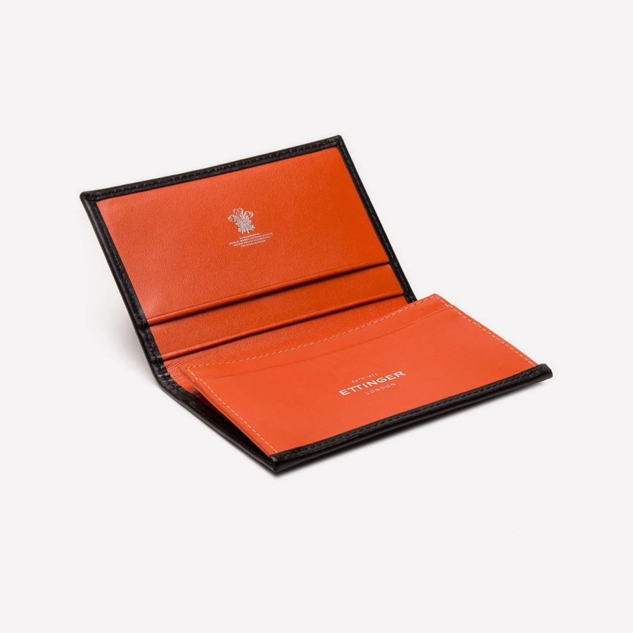 Make a lasting impression when you take out your business cards with this stylish visiting card case. The gusseted pocket allows you to hold several cards and the extra slip pockets can be used to hold the cards you receive. The exterior uses a fine black calf leather while the interior uses a buttery soft Italian calf leather in bold tones, Inspired by the regal hues of British bank notes. 3 credit card slots 1 large card pocket Size:11.5cm x 1.4cm x 7.5cm (closed) Net weight: 46g Outside Leather: Smooth Italian Calf leather Inside Leather: Soft Italian Calf Pocket Linings: Jacquard Fabric