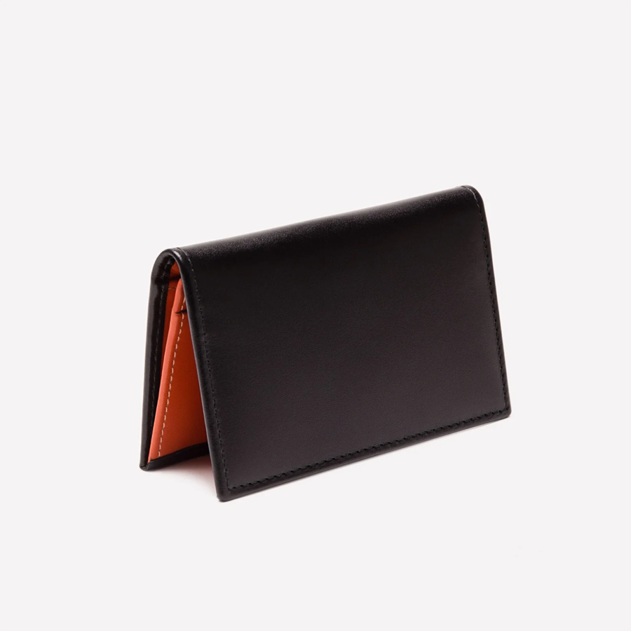 Make a lasting impression when you take out your business cards with this stylish visiting card case. The gusseted pocket allows you to hold several cards and the extra slip pockets can be used to hold the cards you receive. The exterior uses a fine black calf leather while the interior uses a buttery soft Italian calf leather in bold tones, Inspired by the regal hues of British bank notes. 3 credit card slots 1 large card pocket Size:11.5cm x 1.4cm x 7.5cm (closed) Net weight: 46g Outside Leather: Smooth Italian Calf leather Inside Leather: Soft Italian Calf Pocket Linings: Jacquard Fabric