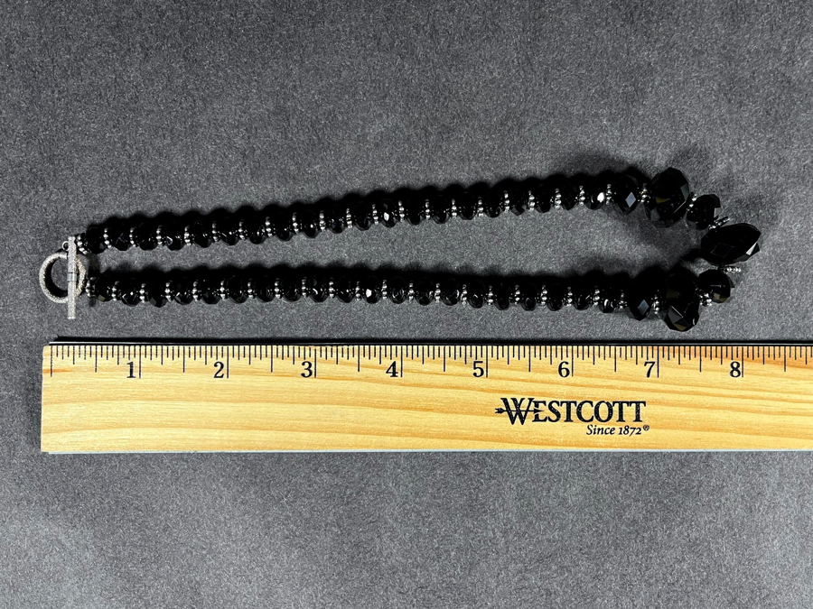 Wear this elegant black cut glass necklace with silver findings for an evening out. Created with cut glass, silver spacers, and a toggle clasp. Measures 15" long.