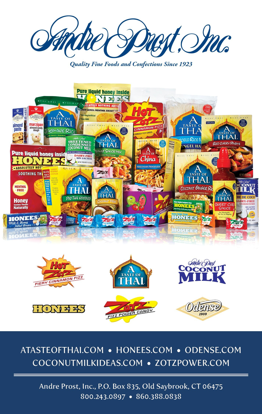An overflowing basket filled to the brim with a variety of fine foods and confections from Andre Prost, a sponsor of The Kate. Among the foods included are: Taste of Thai sauces, coconut milk, spicy peanut bake, jasmine rice; marzipan; Zotz candies; Honees lozenges; and more.