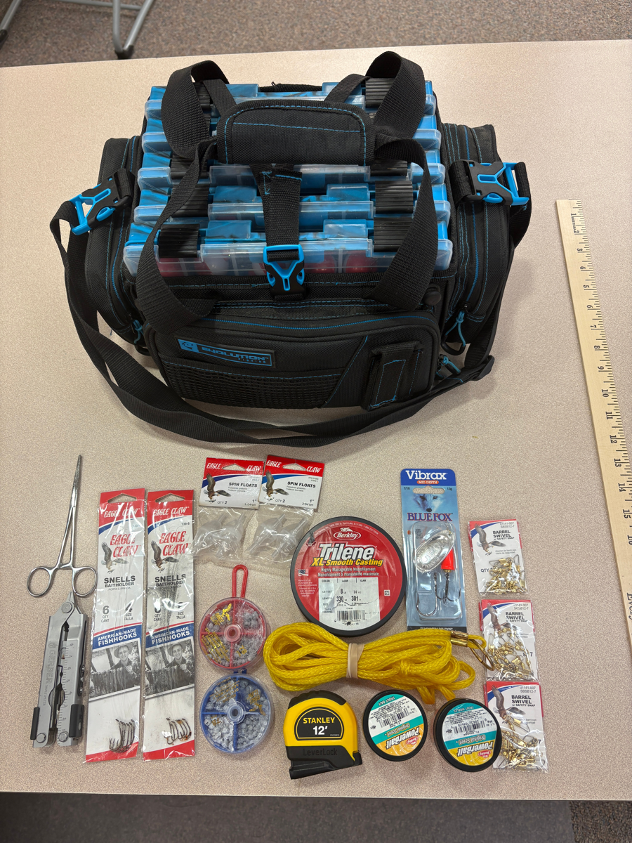Evolution Drift Series Fishing Tackle Bag with all pictured gear, plus 6 bobbers and 21 assorted fishing lures.