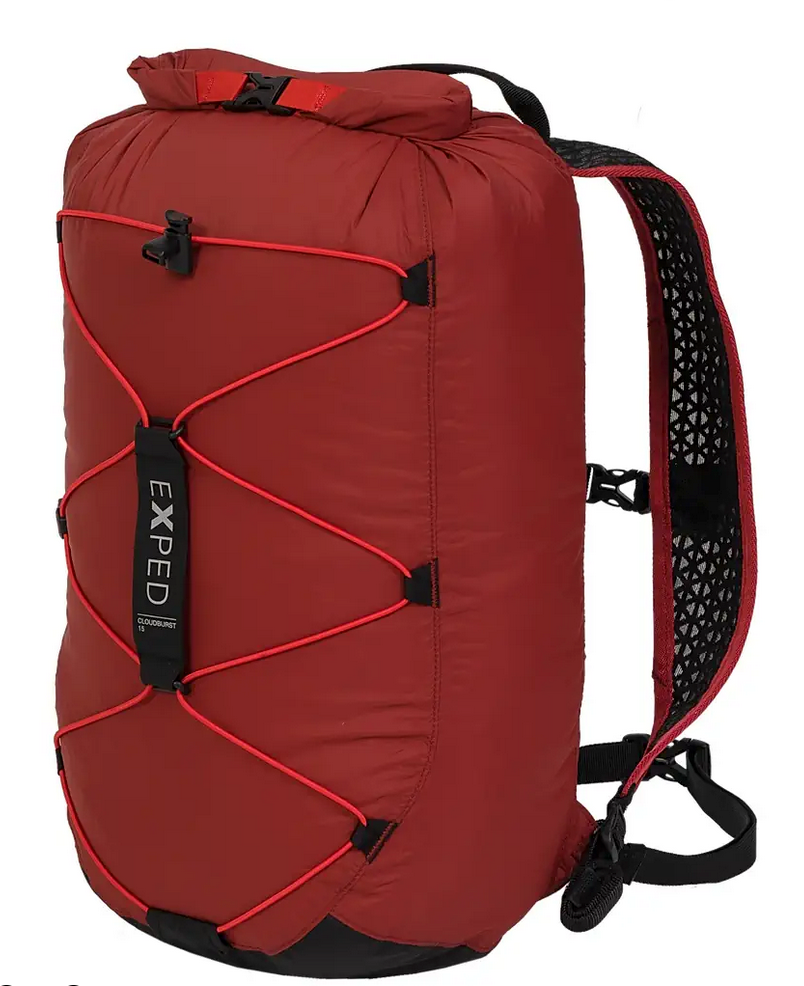 Think of it as a lightweight drybag with comfortable shoulder straps and padding on the back. This Exped backpack is a perfect daypack to stash in your kayak for a walking exploration of islands or trails. Color is burgundy. See details here: https://www.exped.com/en/products/backpacks/cloudburst-15
