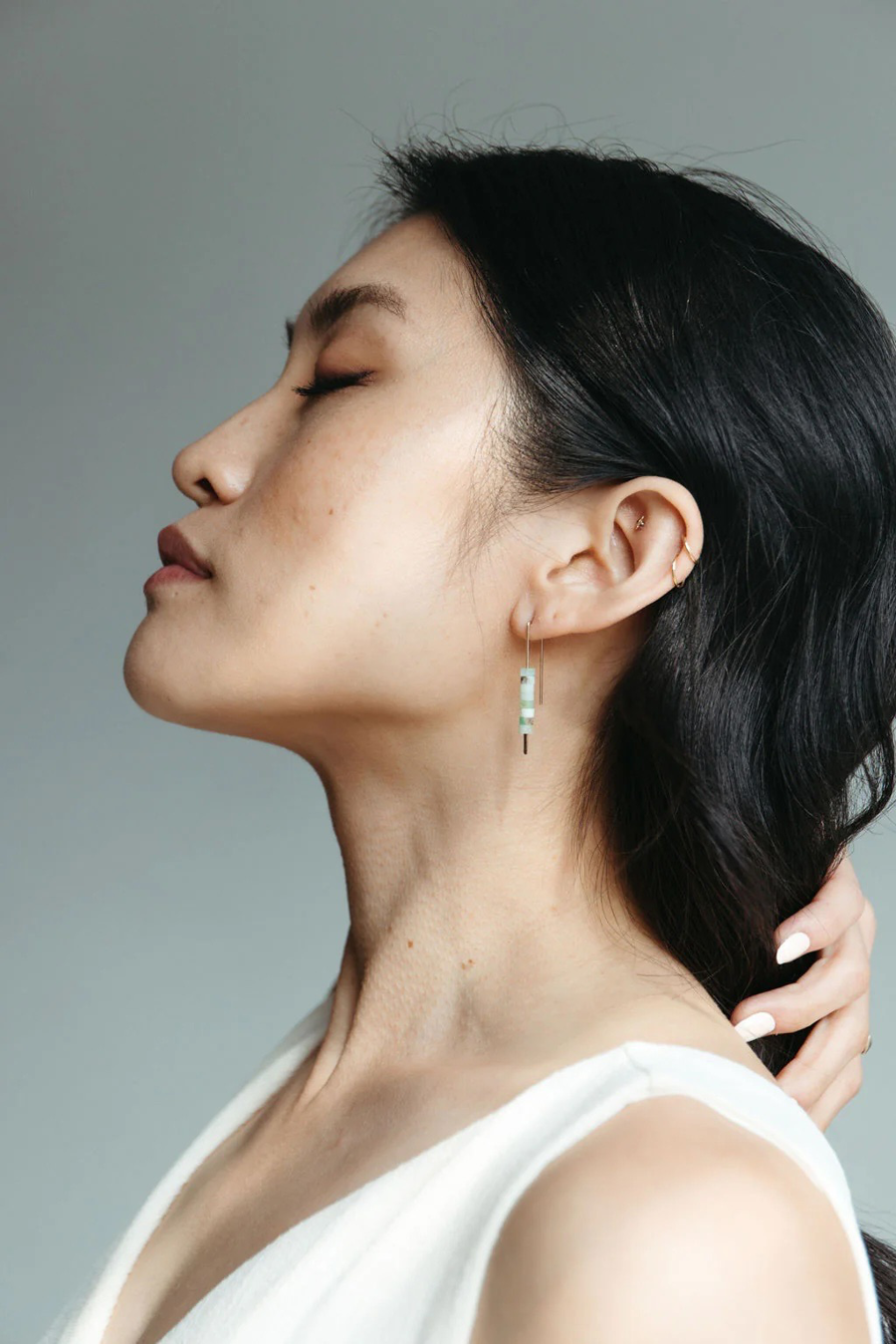 From Austin-based Fail Jewelry, these simple hook earrings are stacked with a wash of translucent blue green beads. The Medium Hook earring with Chrysoprase features a geometric design made with 14k yellow gold fill. They are part of the limited edition Stella collection - these earrings won't be around for long! -Medium Hook with Chrysoprase *14K Yellow Gold Filled *1 1/2" total length Christine Fail is the designer behind Fail Jewelry. With a BFA in studio art, Christine’s background is firmly rooted in art and design. Her introduction into the world of fine jewelry came from working for two of Austin’s top fine jewelers, Anthony Nak and Shaesby, where she learned the trade and business of jewelry. Christine started with a tiny retail store in South Austin and a small collection of handmade jewelry that has since grown to include a storefront in East Austin, a production studio and an ever-growing list of worldwide wholesale partners. As a lifelong learner, Christine loves being a student and continues to bring new techniques, ideas and principles into her business. For her, the creativity of problem solving in business can be just as rewarding as sitting down to carve a wax or sketch new designs. -Fail Jewelry is open by appointment only.