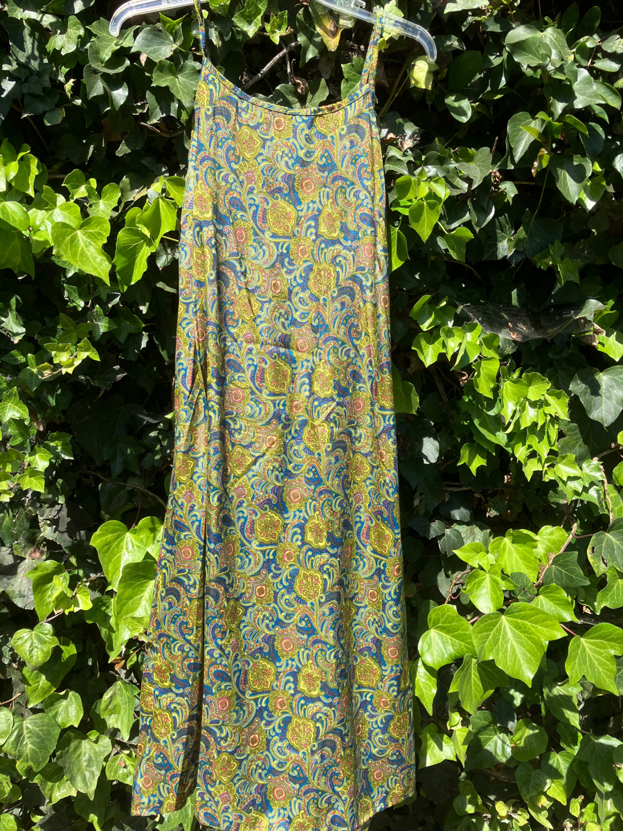 Flowing silk and rayon blend make this set a wonderful choice. A fairy green slip dress with ruffled overdress. Size small.