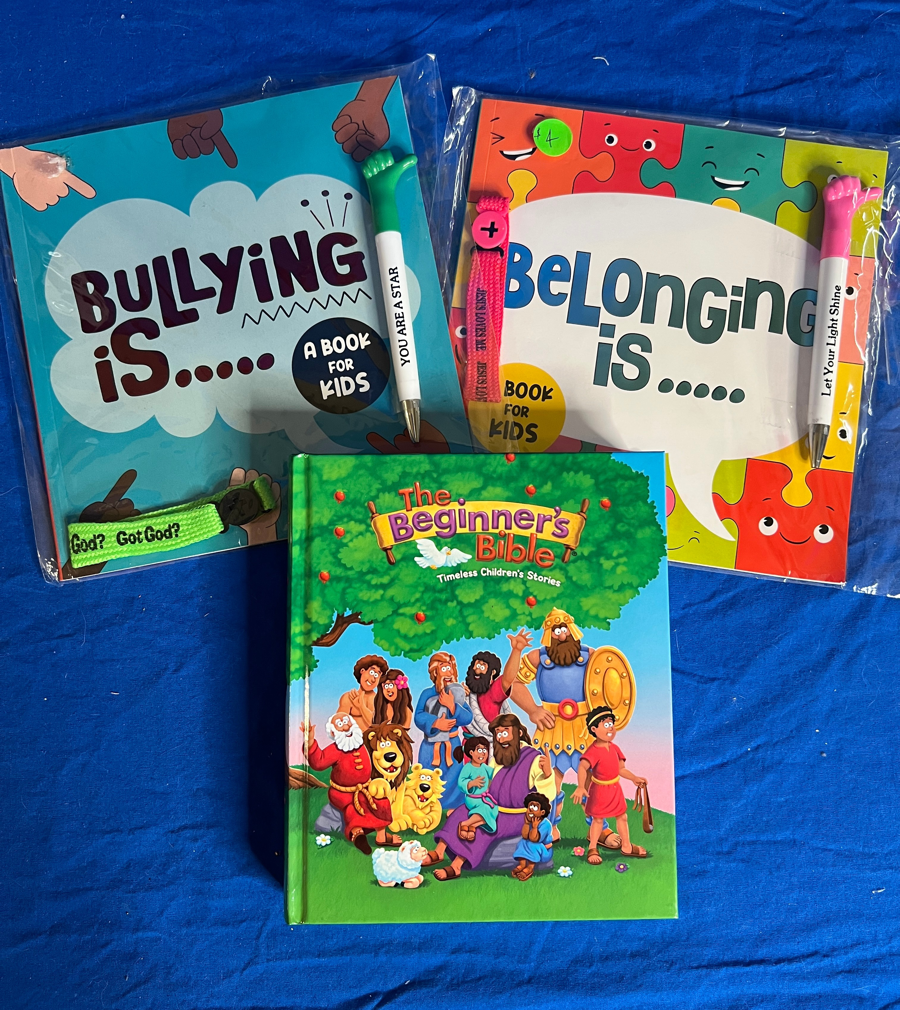 At the heart of this set are two beautifully written children’s books focused on emotional understanding and kindness — one centered on belonging and another addressing bullying — each paired with a bracelet and pen to make reading and reflection interactive and personal. A beginner’s children’s Bible is also included, offering an age-appropriate introduction to faith-based stories for little ones.