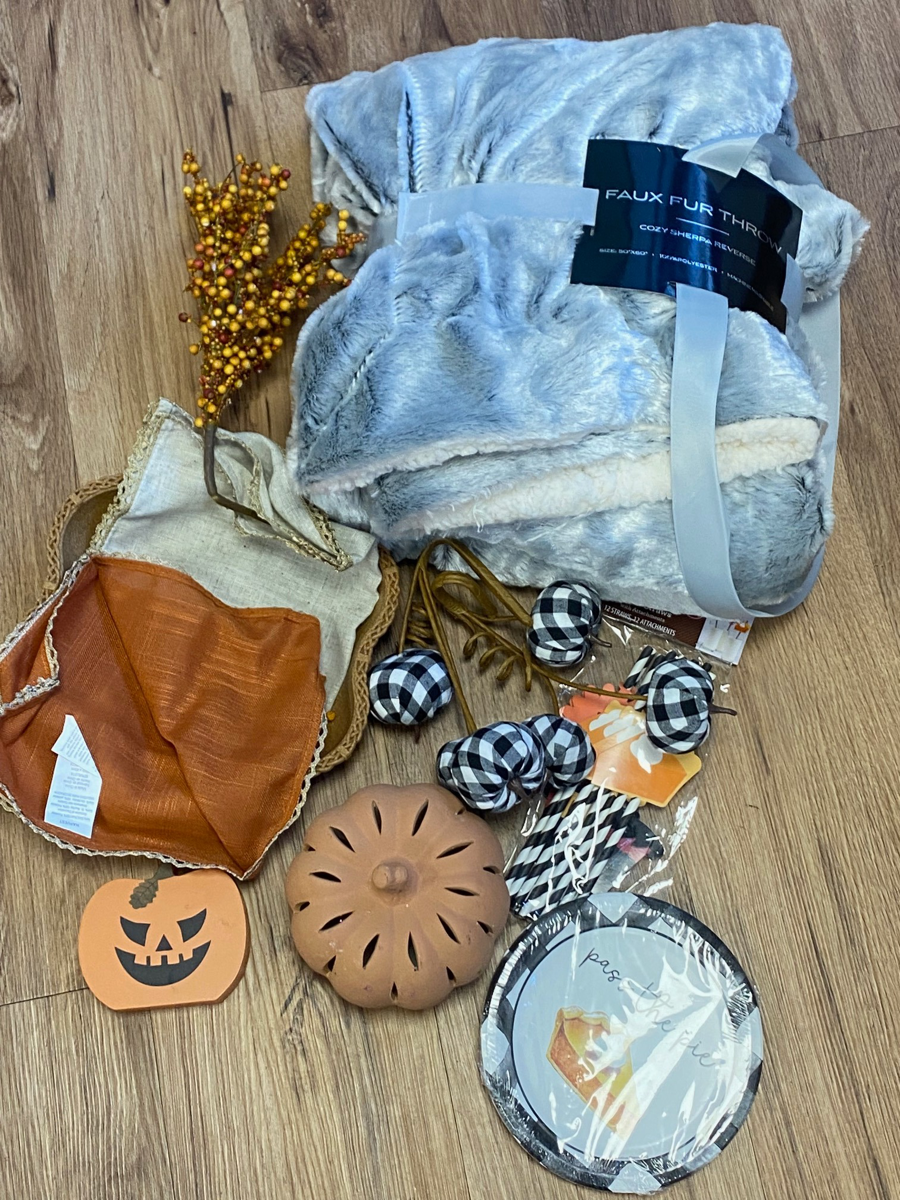 A cozy pumpkin patch all wrapped up. This basket includes: Faux fur throw, pie plates and pumpkin decorations, fall cloth napkins, pumpkin tart burner, pumpkin blessings Jack-o-lantern decorations