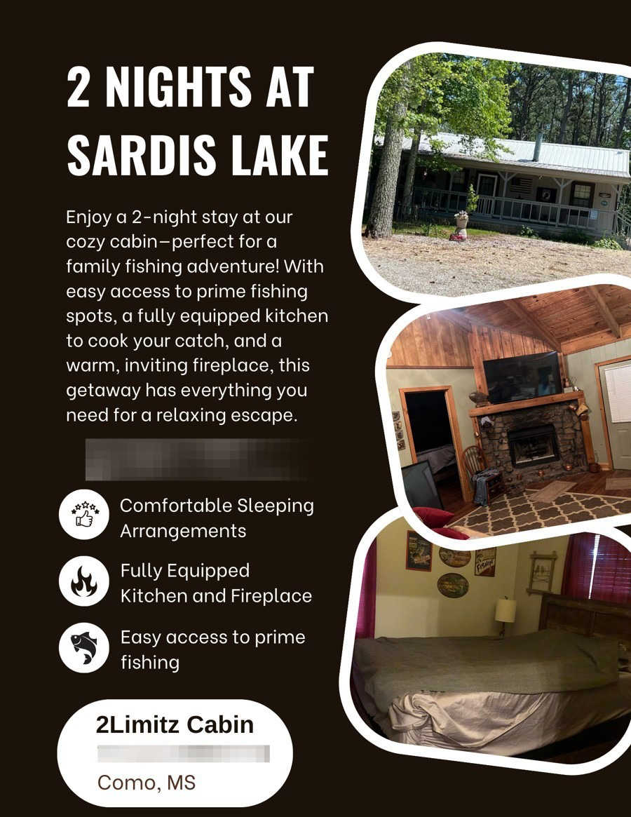 Escape to Sardis Lake in Como, Mississippi, for a relaxing 2-night stay at the cozy 2Limitz Cabin—perfect for a family fishing adventure! Enjoy easy access to prime fishing spots and unwind in comfort after a day on the water. The cabin features a fully equipped kitchen to cook up your catch, a warm and inviting fireplace, and plenty of sleeping space with two queen beds and three twin beds—ideal for families of all sizes.