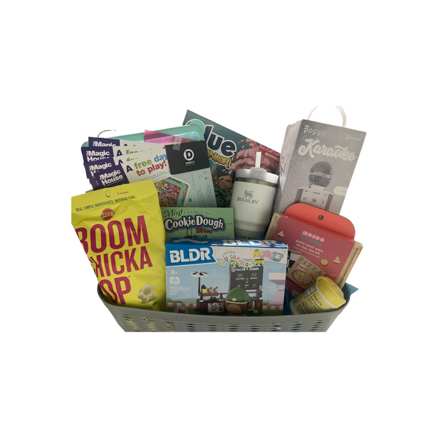 Kick off the fun with 4 free day passes to The Magic House for an unforgettable day of hands-on learning and play, plus a $25 gift card to Dewey’s Pizza—perfect for a family meal. Also included is a white Stanley Quencher to keep drinks cold during all your adventures. This basket is packed with at-home entertainment too, featuring a Bluetooth karaoke microphone for sing-along fun, Clue Junior, a Squishmallows builder, and a paint-your-own tic-tac-toe kit for creative play. A take-and-go snack box and additional snacks round out this exciting bundle. A fantastic mix of experiences, games, creativity, and treats—perfect for family nights and memory-making!