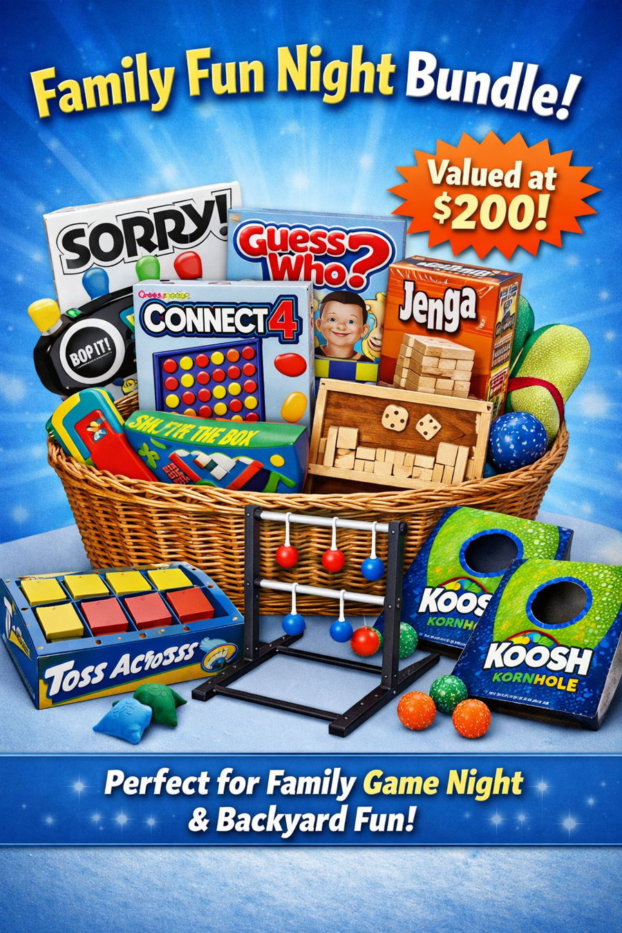 Bring the fun home with this Ultimate Game Night Basket for all ages! Enjoy classic favorites like Sorry!, Connect 4, Guess Who?, and Jenga, along with interactive games like Bop It! and a fun Koosh game set. Or take the competition outside with a ring toss game set and other engaging activities that are perfect for parties, backyard fun, or family gatherings. Donated by Hudson Valley HI-roes