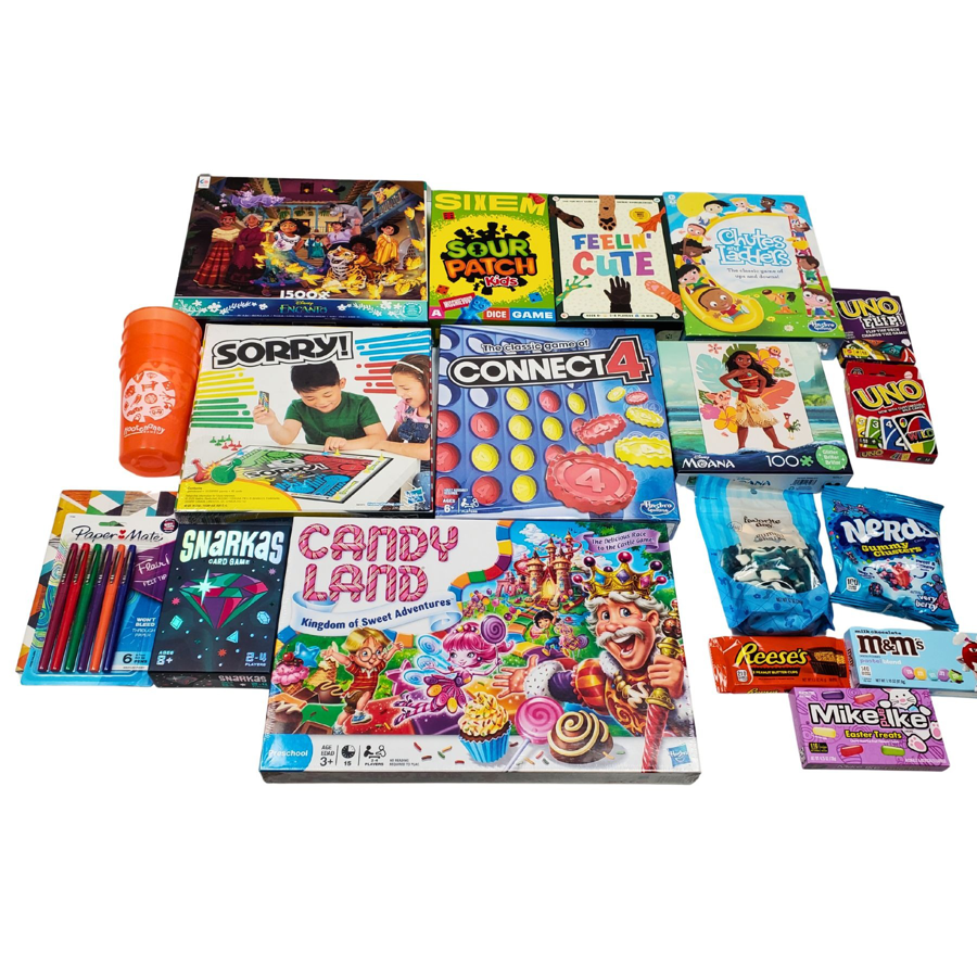 The winning bidder will take home a basket filled with fun games and snacks for the family. This basket includes a 1500 pc Encanto puzzle, Feelin Cute, Chutes & Ladders, Uno and Uno Flip, 100 pc Moana puzzle, Connect 4, Candy Land, Sorry!, Snarkas Card Game, Sixem Dice Game, Hootenanny Games cups, a notebook and pens (for keeping score, of course!) and assorted candies to share.