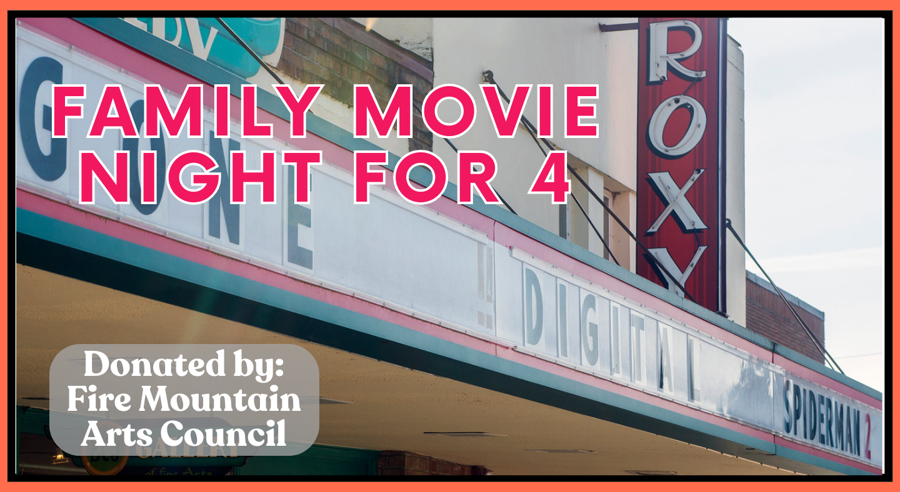 Movie night at the Roxy! Gift certificate for 2 adult & 2 children admission, 1 large popcorn, and 4 small sodas.