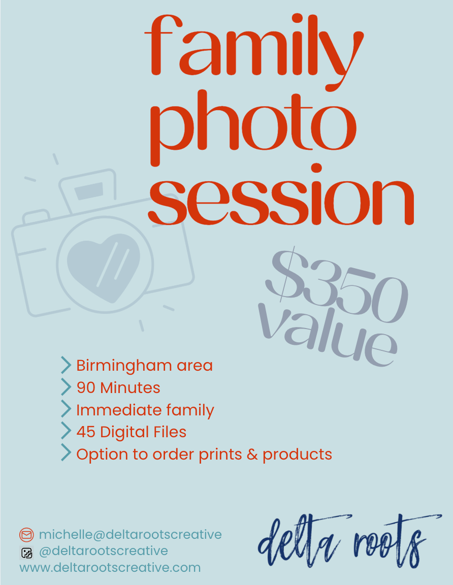 This is for a family photo session with Michelle Kendrick of Delta Roots. Photo session is for 90 minutes with your immediate family and 45 digital files.