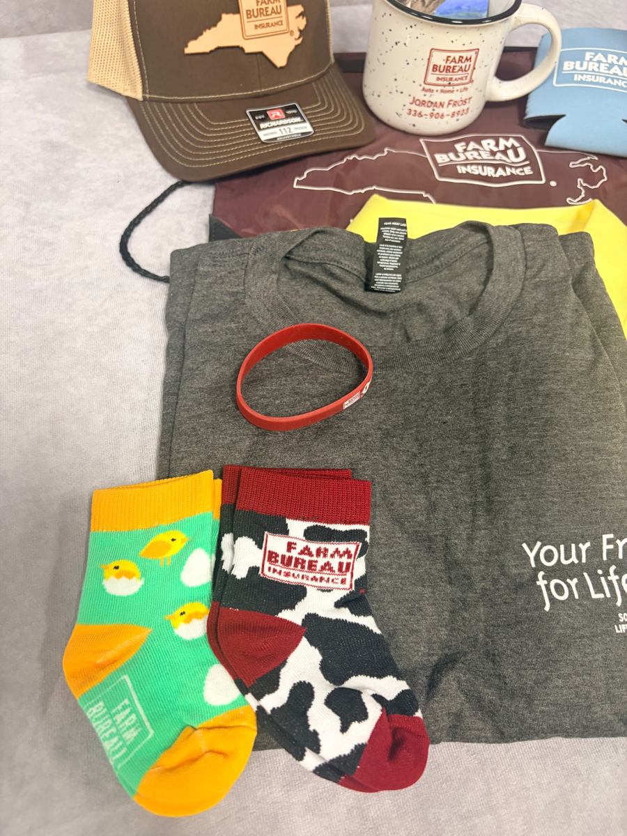 Great bundle from Farm Bureau. Hat, 2 shirts, bag, coffee mug, koozie, cup set, scissors, mini level, baby chick print socks/baby cow print socks, draw string bag and window scrapper.