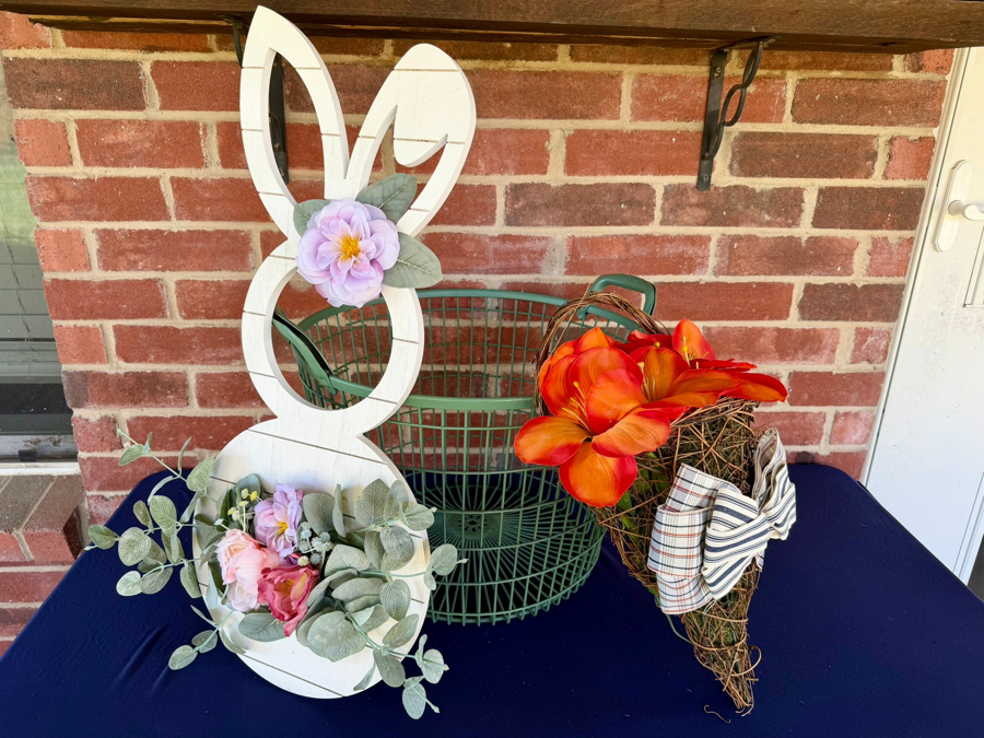 The Bunny: A large, whitewashed Shiplap Wooden Bunny featuring intricate floral arrangements and soft greenery.
