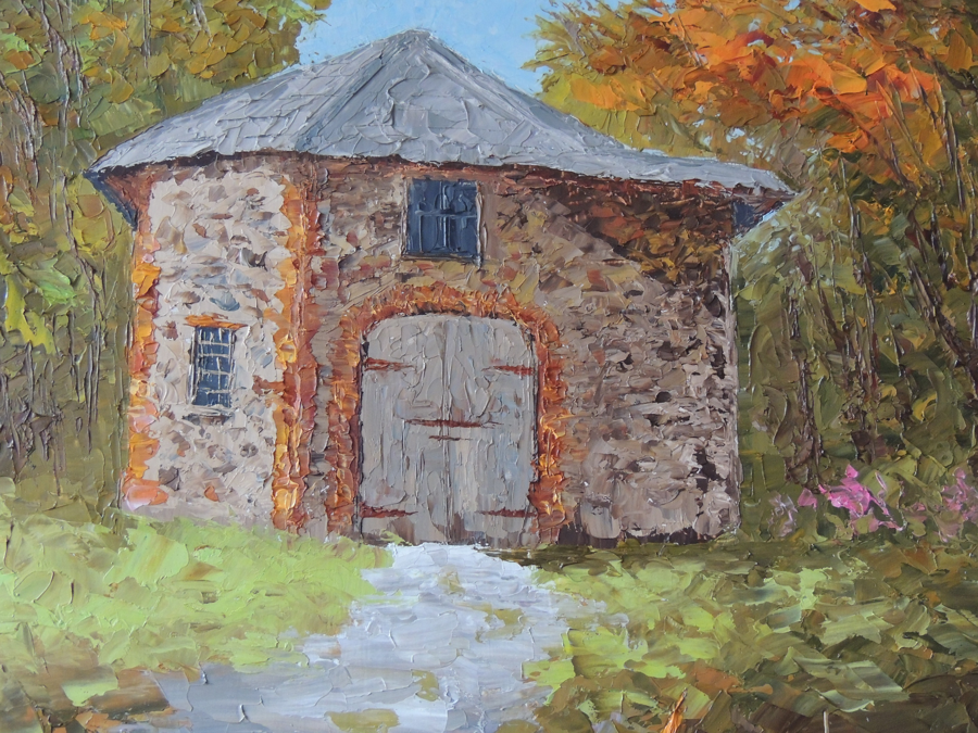 Fairfield County, CT. 9x11". Located in downtown Westport, this seven-sided cobblestone barn, with its unusual octagonal roof, traces back to the late 18th century. Now converted into a museum, thanks to locals, including the late Paul Newman and his wife. This painting can be seen at the Fulton County Historical Society - located in Fayette, OH. Call with questions or to see painting. The Historical Society can be reached at (419) 388-3518