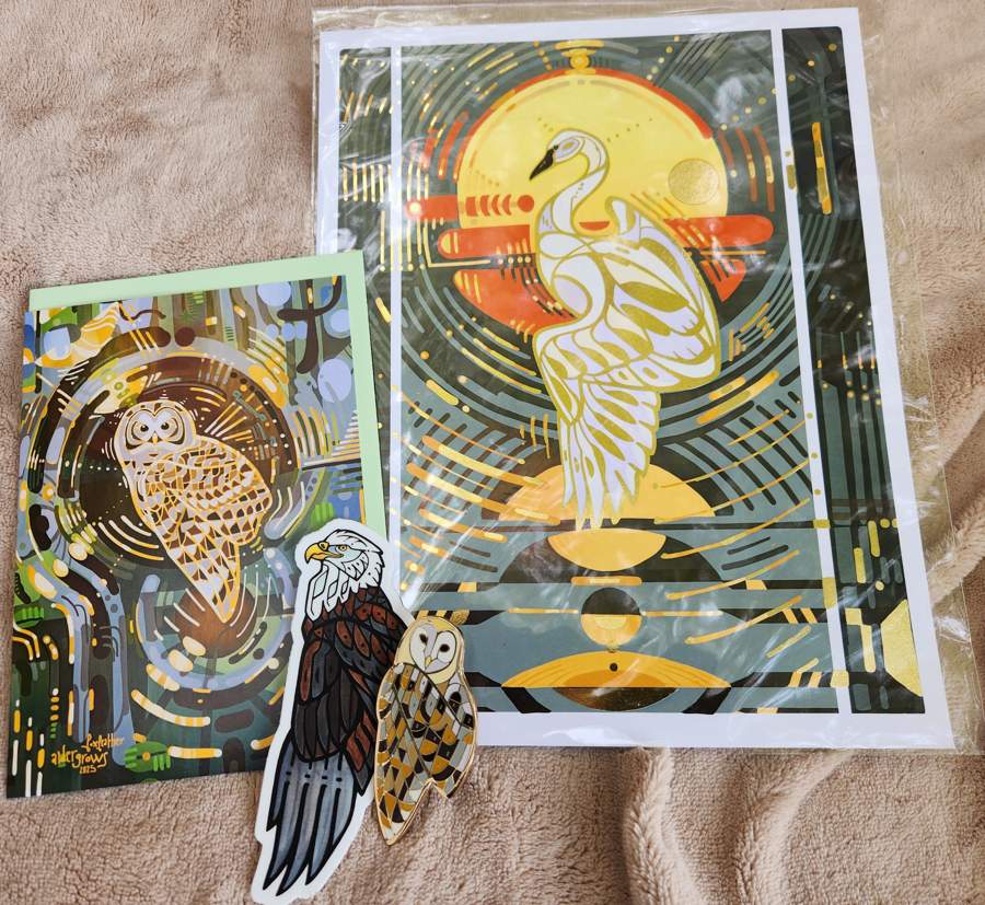A stunning celebration of wildlife and the artists who protect it. This beautifully curated set features works and accessories from a partnered donation by Aldergrows.com, an artist known for supporting multiple wildlife rescues and your very own OWL auction host with pieces from artist foxfeather (foxloft.com). Includes: - 8x10 Swan Art Print (aldergrows) Elegant and serene, with signature goldleaf outlines that shimmer like frost on feathers. - Barred Owl Greeting Card (aldergrows) A quiet moment captured in ink and light which is perfect for sending or framing. - Bald Eagle Vinyl Sticker (foxfeather) Bold and majestic, ready to perch on your laptop, water bottle, or notebook. - 2½" Barn Owl Pin/Brooch (foxfeather) A wearable tribute to nocturnal beauty which is detailed, delicate, and full of character. Foxfeather unique artistic style creates pieces that feel both timeless and magical. Every item in this set is a nod to the wild and the wonder it inspires. A perfect gift for bird lovers, art collectors, or anyone who believes in the power of beauty and conservation.