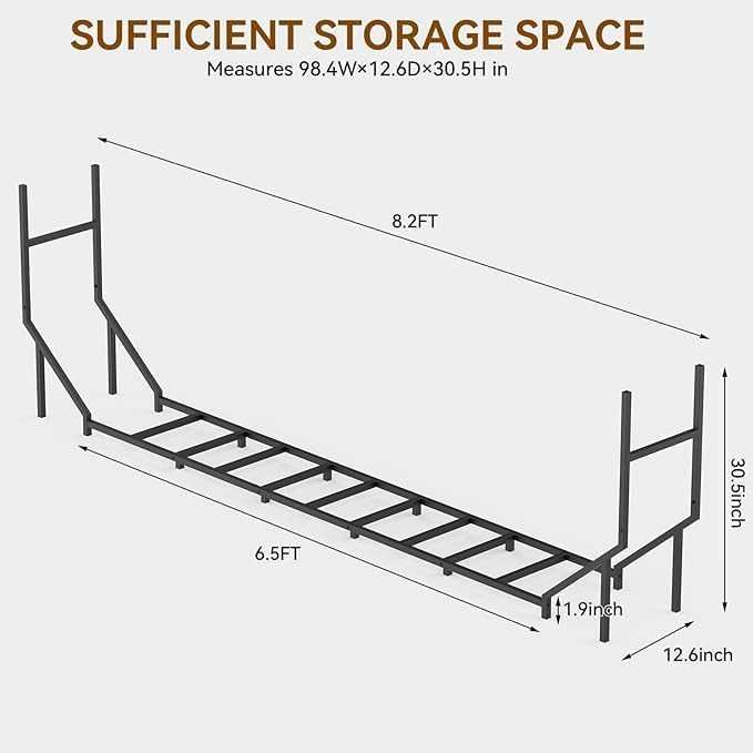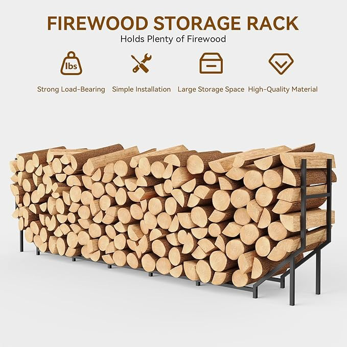 This 8.6-foot firewood rack is the perfect firewood organizer for your porch or outdoor space. This durable and stylish firewood rack is designed to keep your firewood neatly stacked and easily accessible. Whether you're preparing for cozy evenings by the fire or simply need a practical storage solution, this firewood organizer will enhance your outdoor experience while keeping your firewood dry and organized.