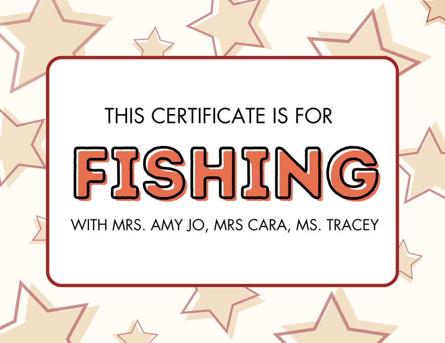 Join us for an unforgettable fishing experience with Mrs. Amy Jo, Ms. Tracey and Ms. Cara! This auction item offers you the chance to fish alongside these two experienced anglers (Guaranteed to catch a live fish and get a lesson on how to fish). Whether you're a seasoned fisherman or a beginner, Mrs. Amy Jo, Ms. Tracey and Ms. Cara will share their expertise and tips to help you reel in the big catch. Don't miss this opportunity to create lasting memories while enjoying a day by the water with fantastic company. Bid now for your chance to fish with Mrs. Amy Jo, Ms. Tracey and Ms. Cara!