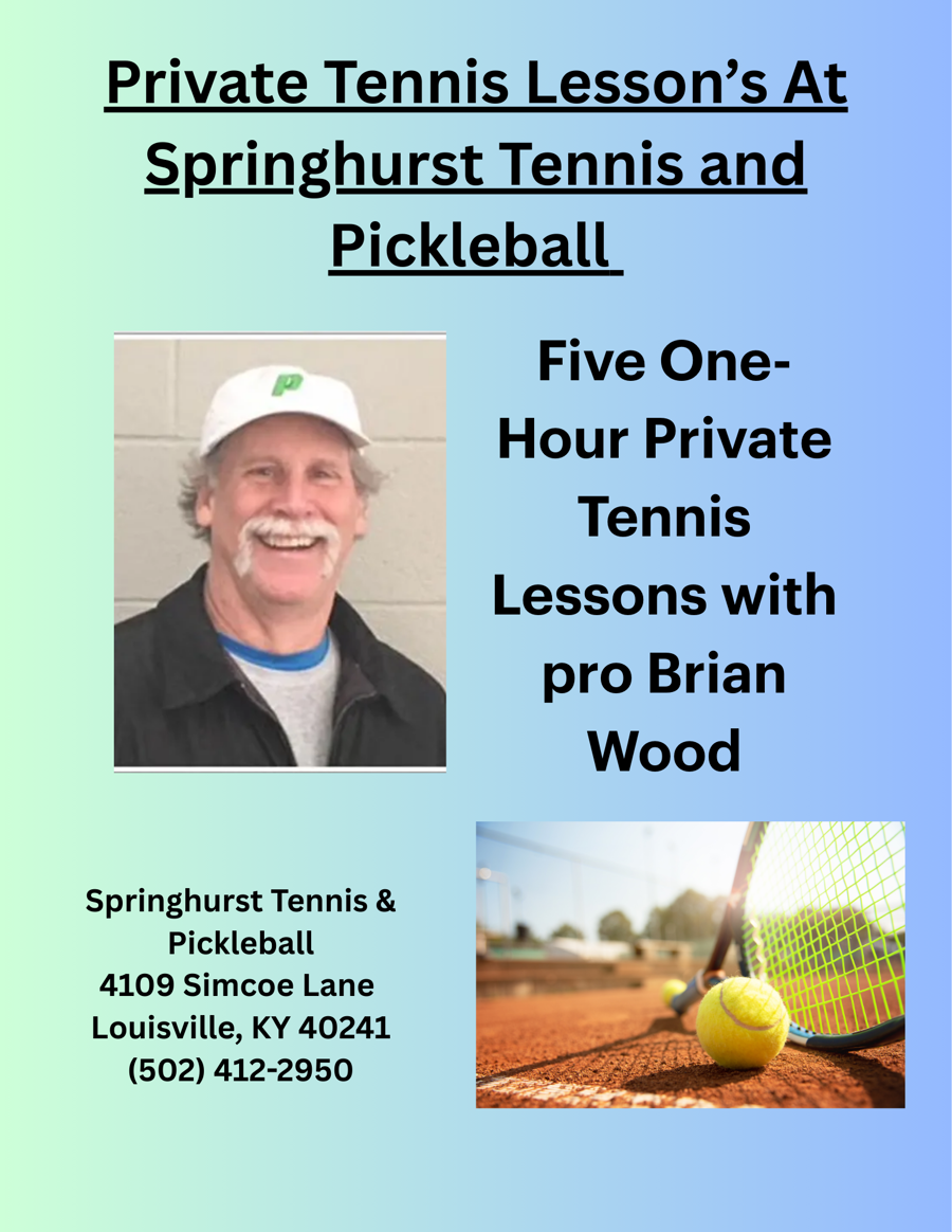Five 1 HR Private Tennis lessons at Springhurst with Hall of Fame Member Brian Wood