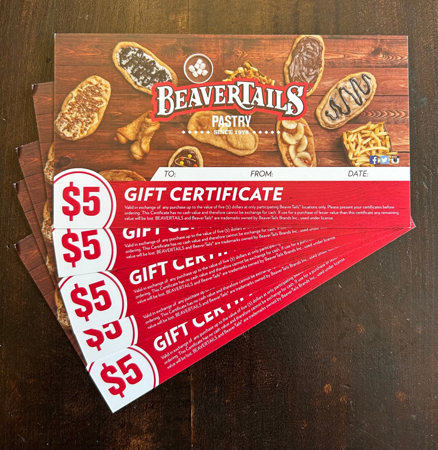 Five $5 gift certificates to Beavertails Kingston for a total of $25. Beavertails isn’t just about pastries! From savory bites to satisfying meals, we’ve got options to fuel your adventure. Whether you're looking for a quick snack, a sweet fix, or a comforting meal, there’s something delicious waiting for you.